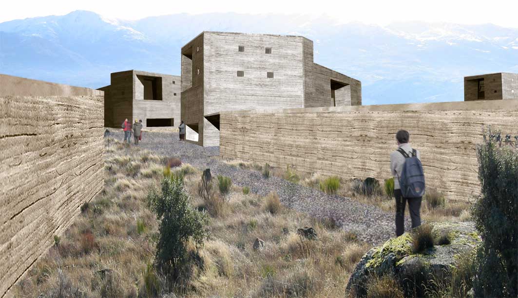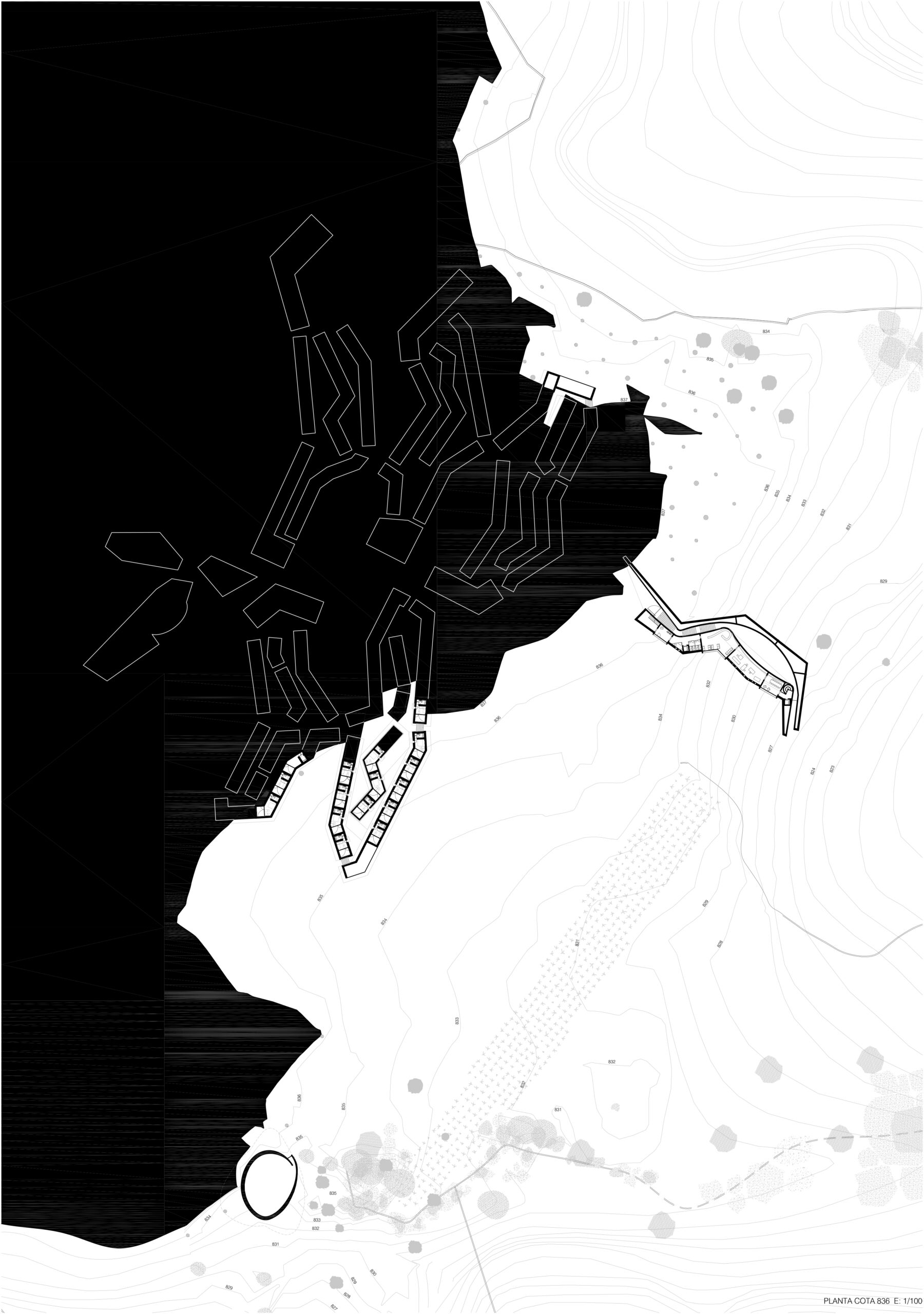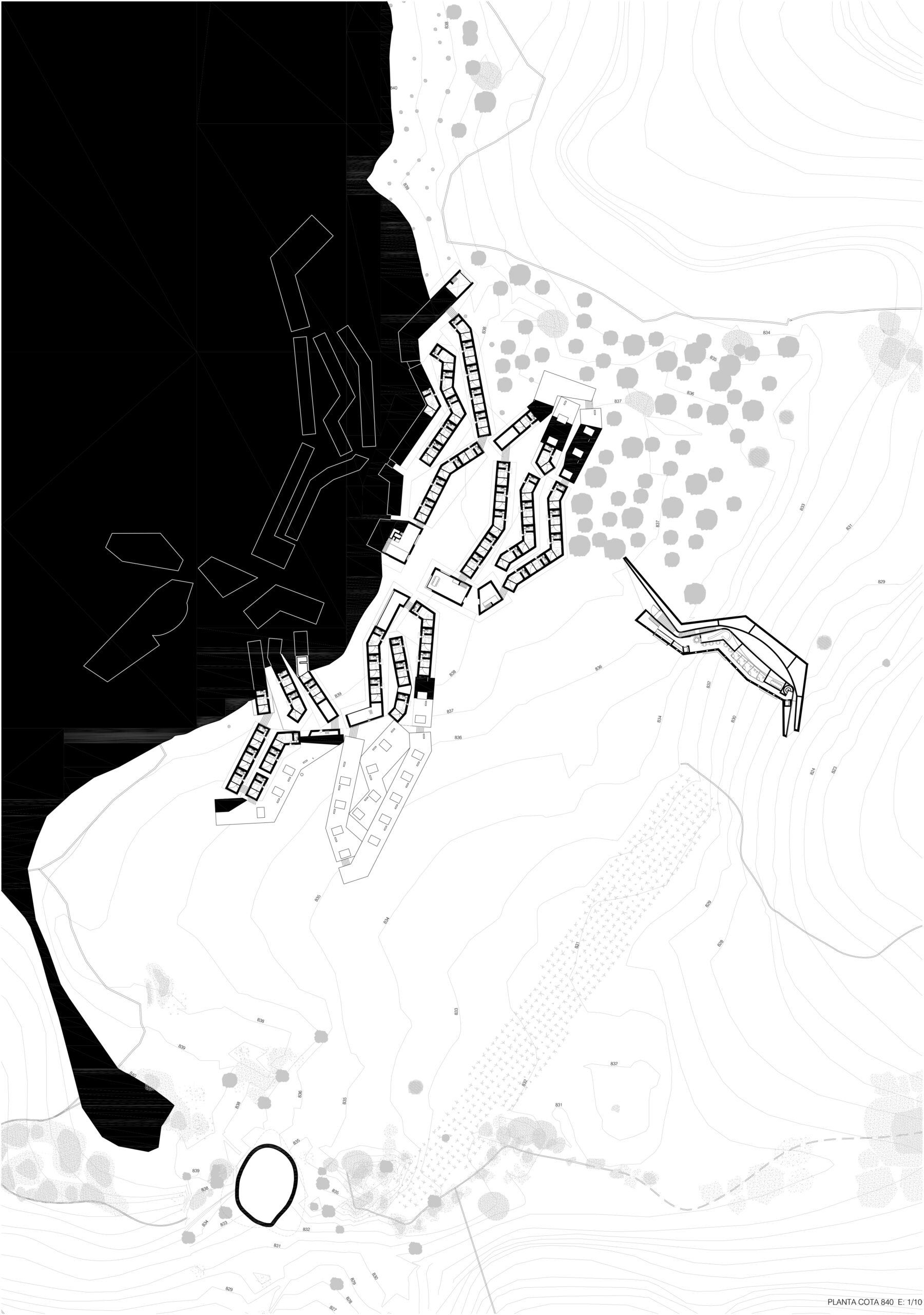 The earth excavated on place, poured in formworks and rammed with great strength becomes the bearing walls. Once excavated, the granite base that lies beneath will come to the surface. This stone plate will become the pavement flooring between the Moradas. Building geometry stays close to the ground following the topography without terracing, avoiding unnecessary excavations and retaining walls. Inspired by the great granite boulders covered with moss and lichen, the rammed earth walls reflect and absorb the intense natural light of this landscape.