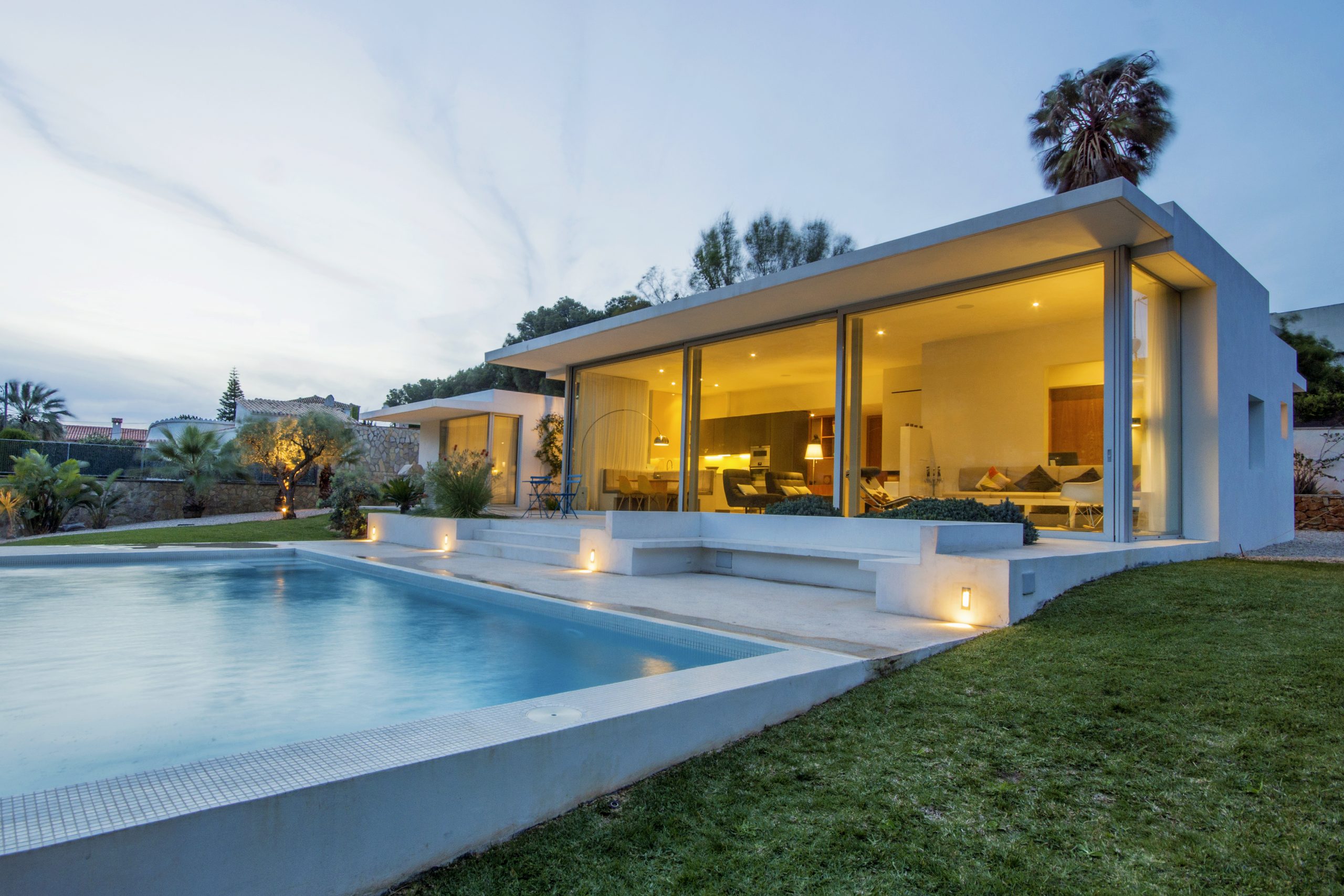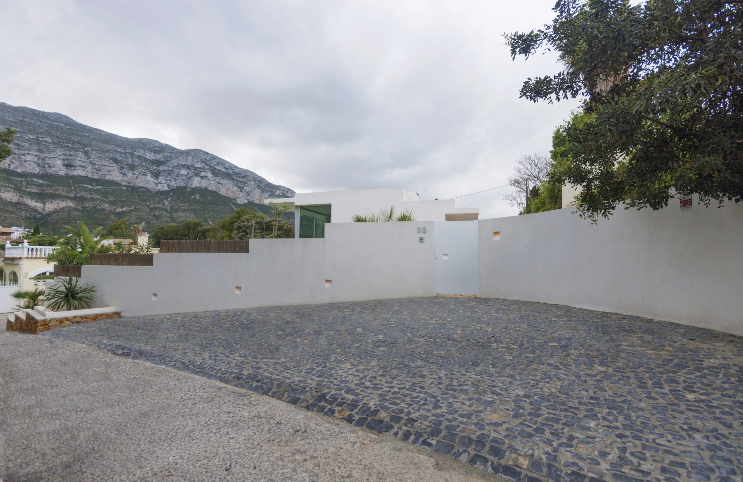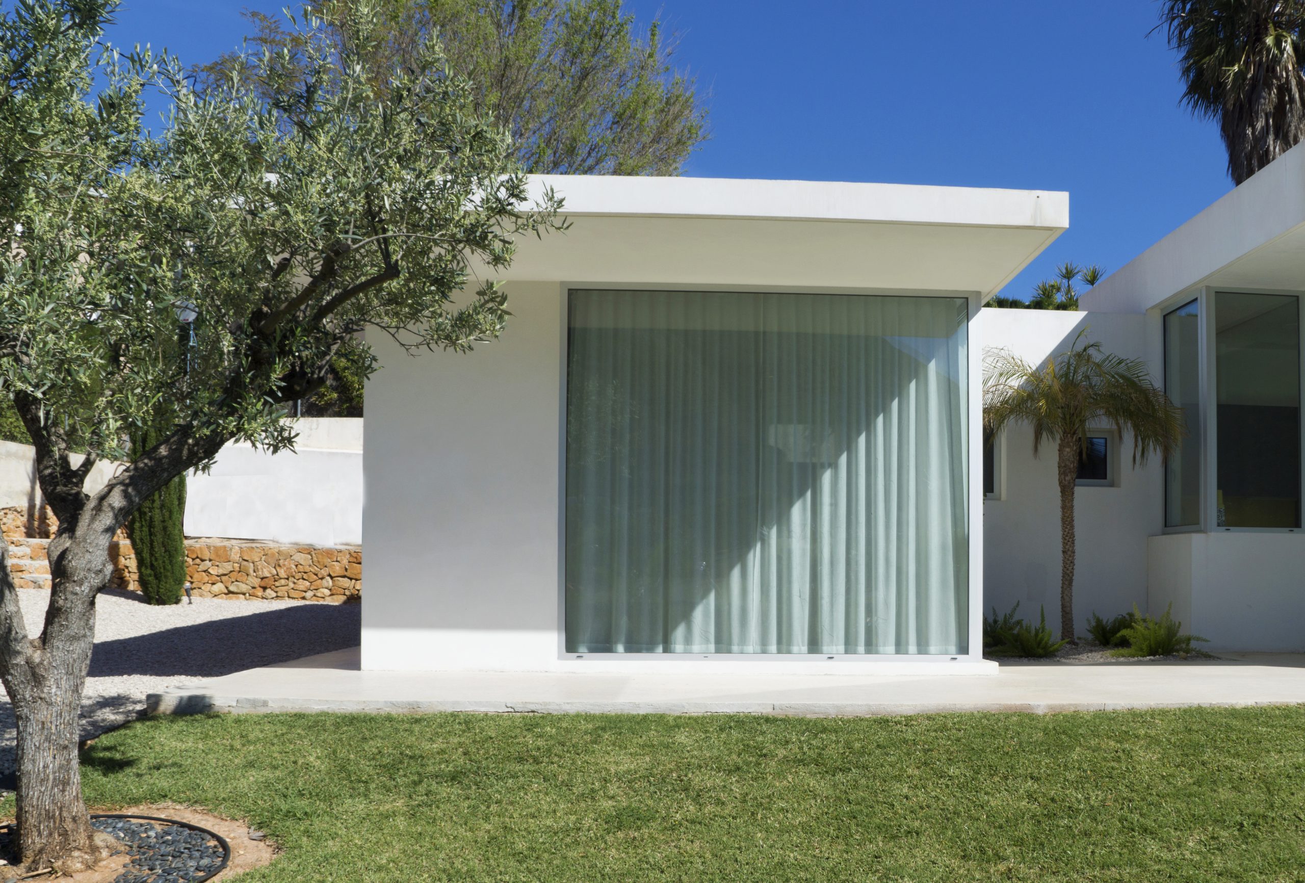 Dieses kleine Juwel, ein weißes und schlichte Gebäude von 120 m2 ist immer dem Montgó zugewandt, dessen kraftvolle Präsenz ihn zu einem wichtigen Bewohner des Hauses macht. Nach Norden hin ist es klein und konzentriert, eine weiße Wand mit nur wenigen Öffnungen. Die Südfassade ist zum Licht und zum Berg hin offen und schlank und besteht aus großen Glasschiebeelementen und Dachvorsprüngen, die das Innere vor der intensiven Sommersonne schützen sollen. Polierter Beton, verputzte Wände und Ahornholzverkleidungen bilden die Materialpalette, die für die Gestaltung des Raums verwendet wurde.
