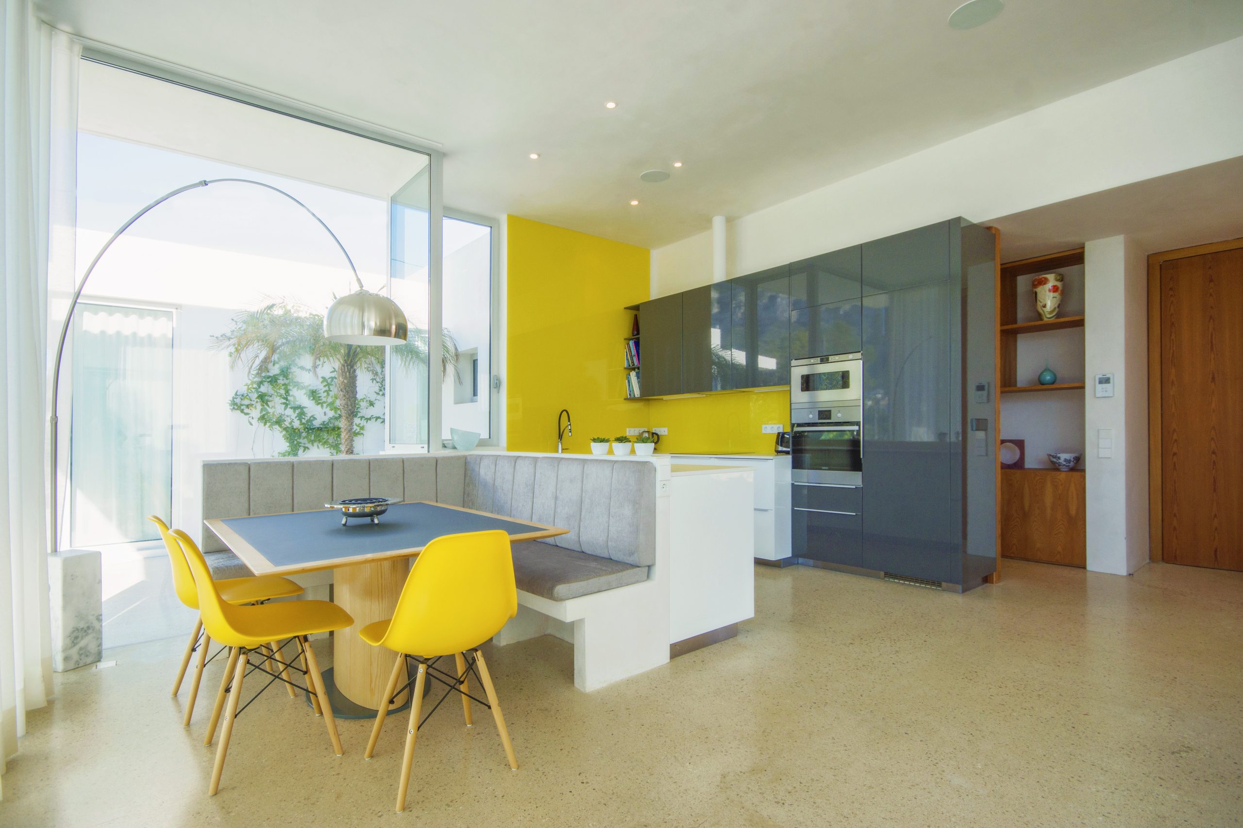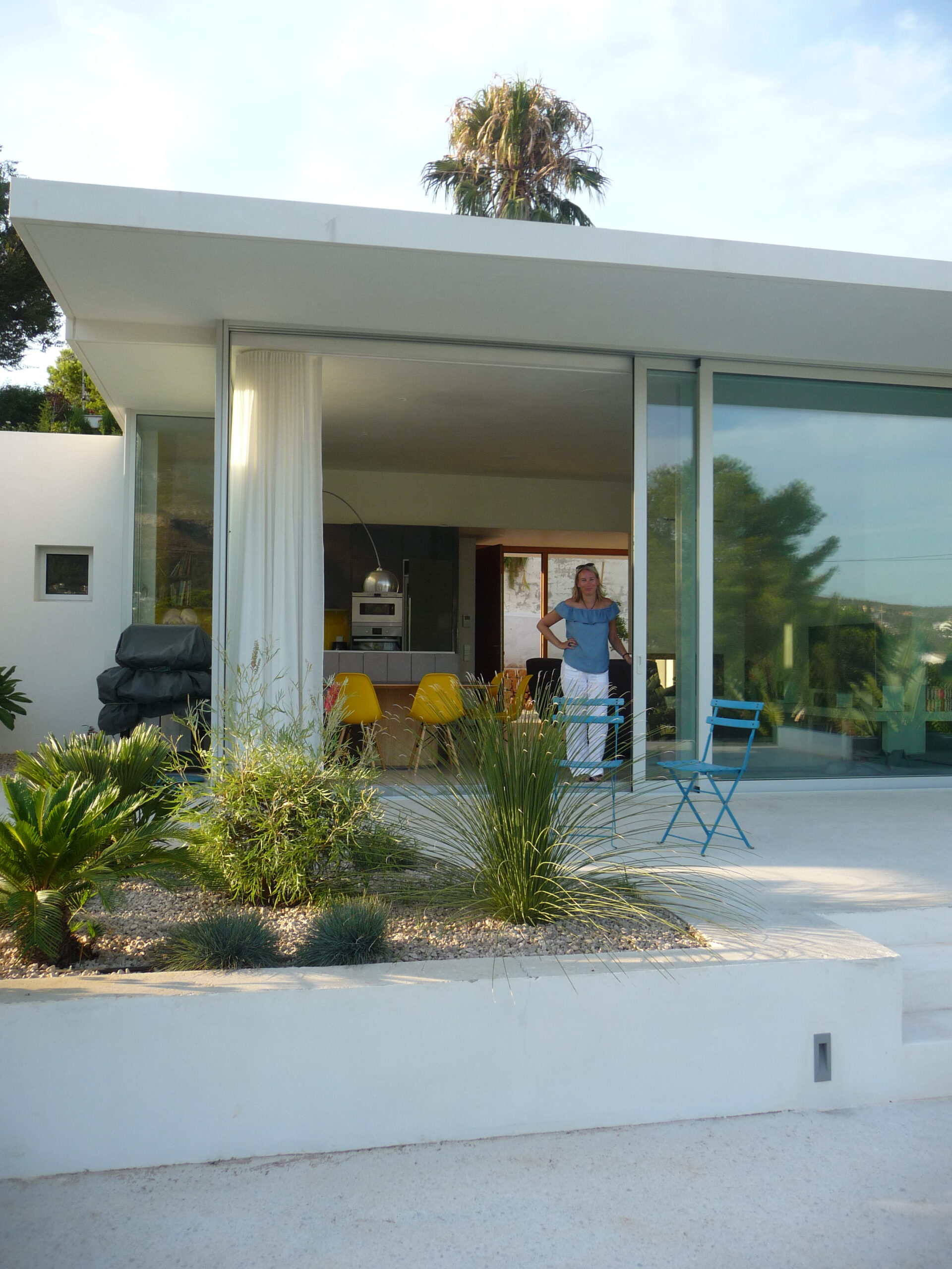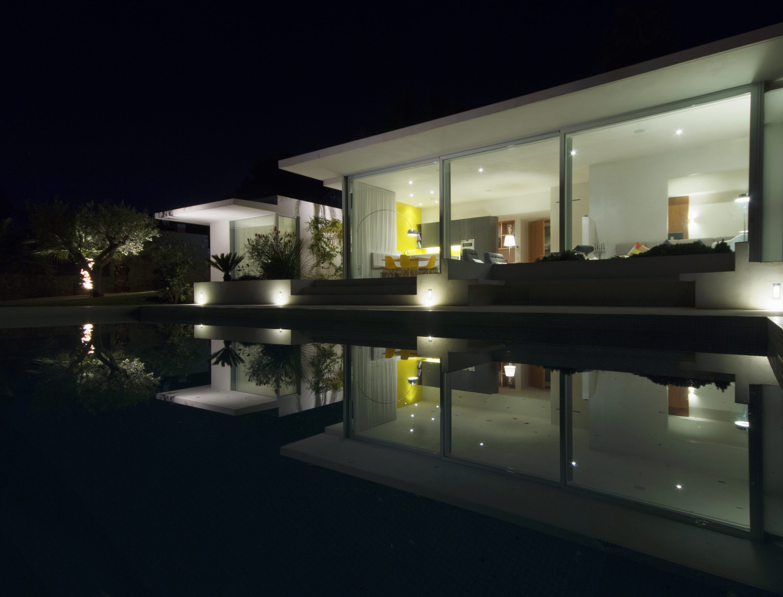 Dieses kleine Juwel, ein weißes und schlichte Gebäude von 120 m2 ist immer dem Montgó zugewandt, dessen kraftvolle Präsenz ihn zu einem wichtigen Bewohner des Hauses macht. Nach Norden hin ist es klein und konzentriert, eine weiße Wand mit nur wenigen Öffnungen. Die Südfassade ist zum Licht und zum Berg hin offen und schlank und besteht aus großen Glasschiebeelementen und Dachvorsprüngen, die das Innere vor der intensiven Sommersonne schützen sollen. Polierter Beton, verputzte Wände und Ahornholzverkleidungen bilden die Materialpalette, die für die Gestaltung des Raums verwendet wurde.