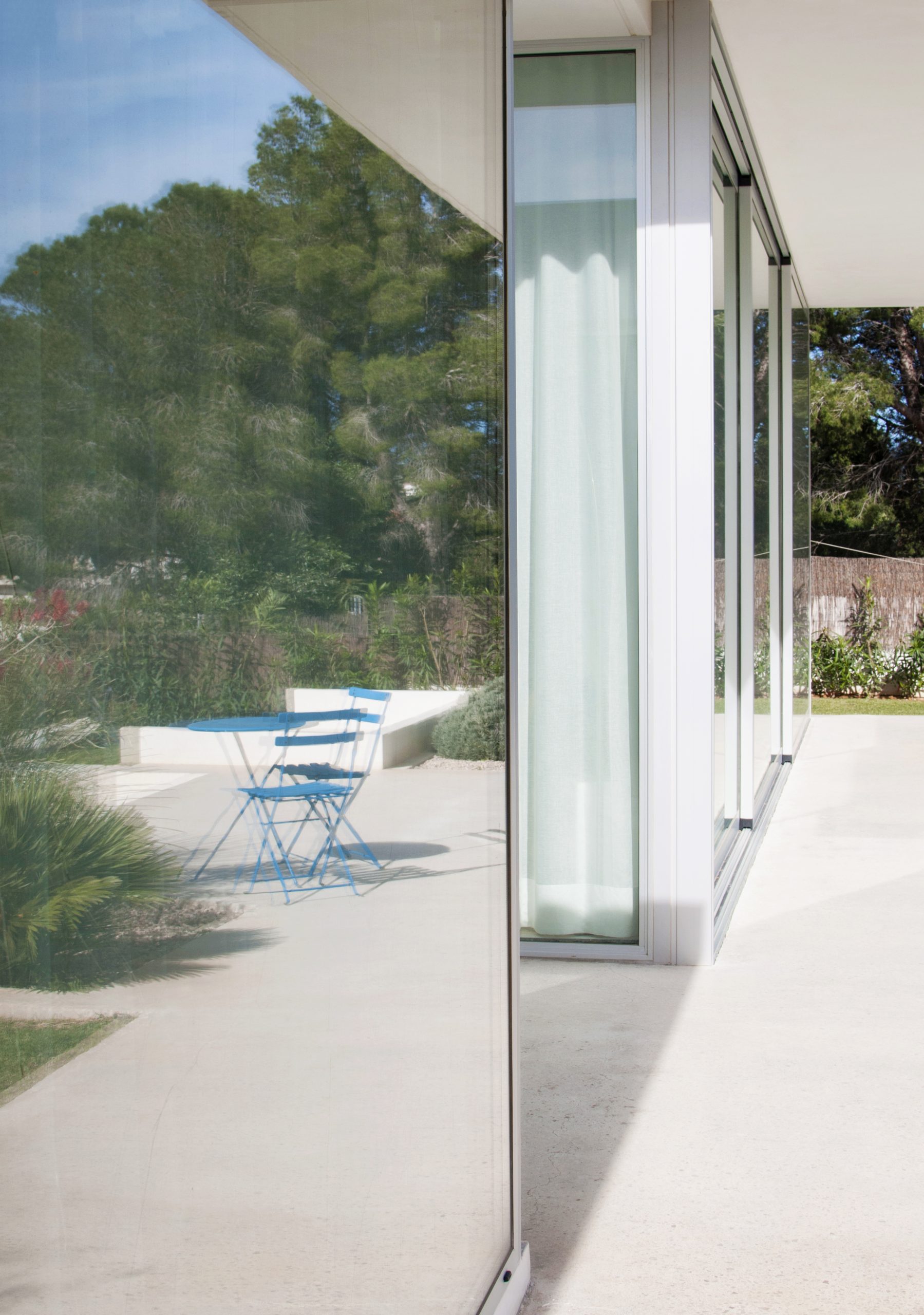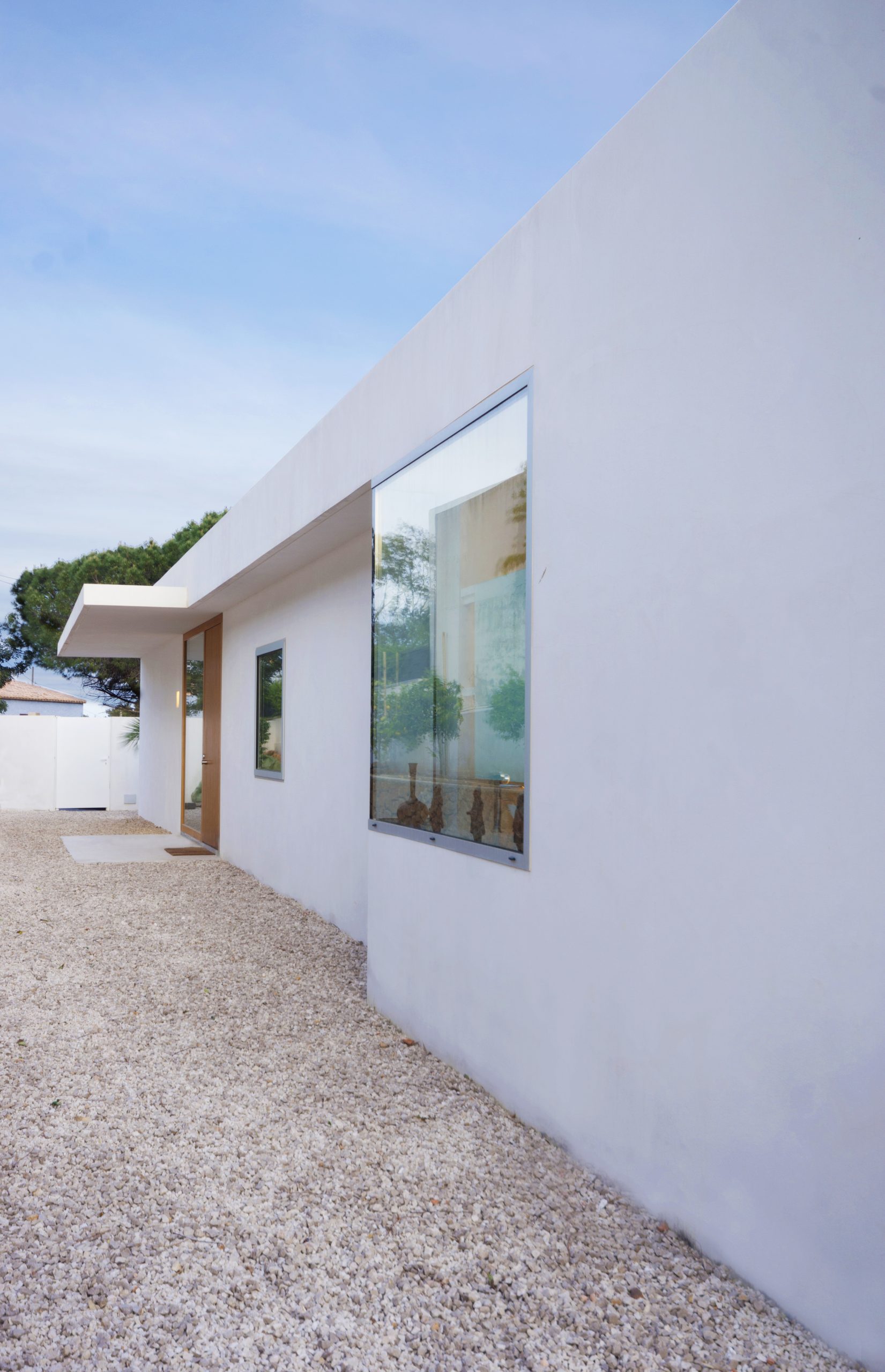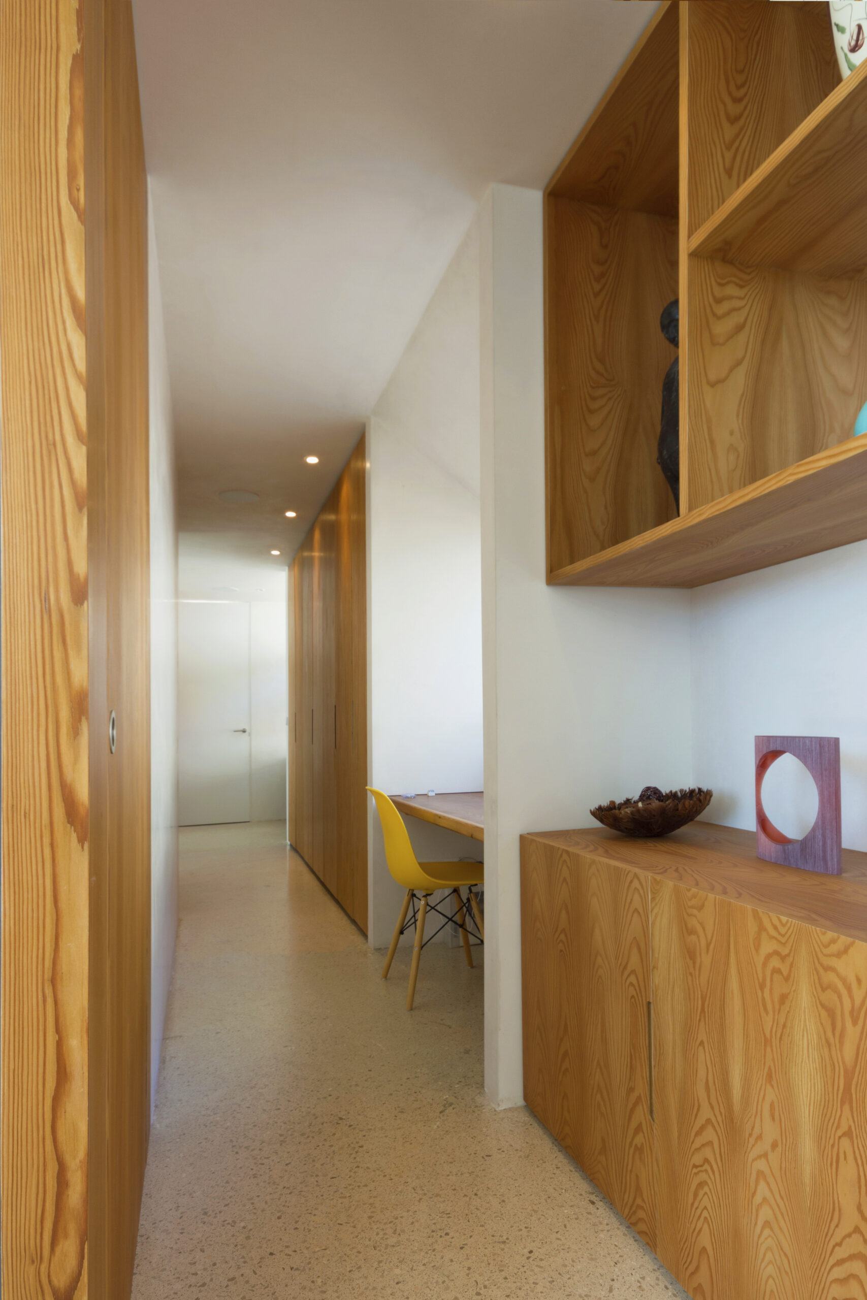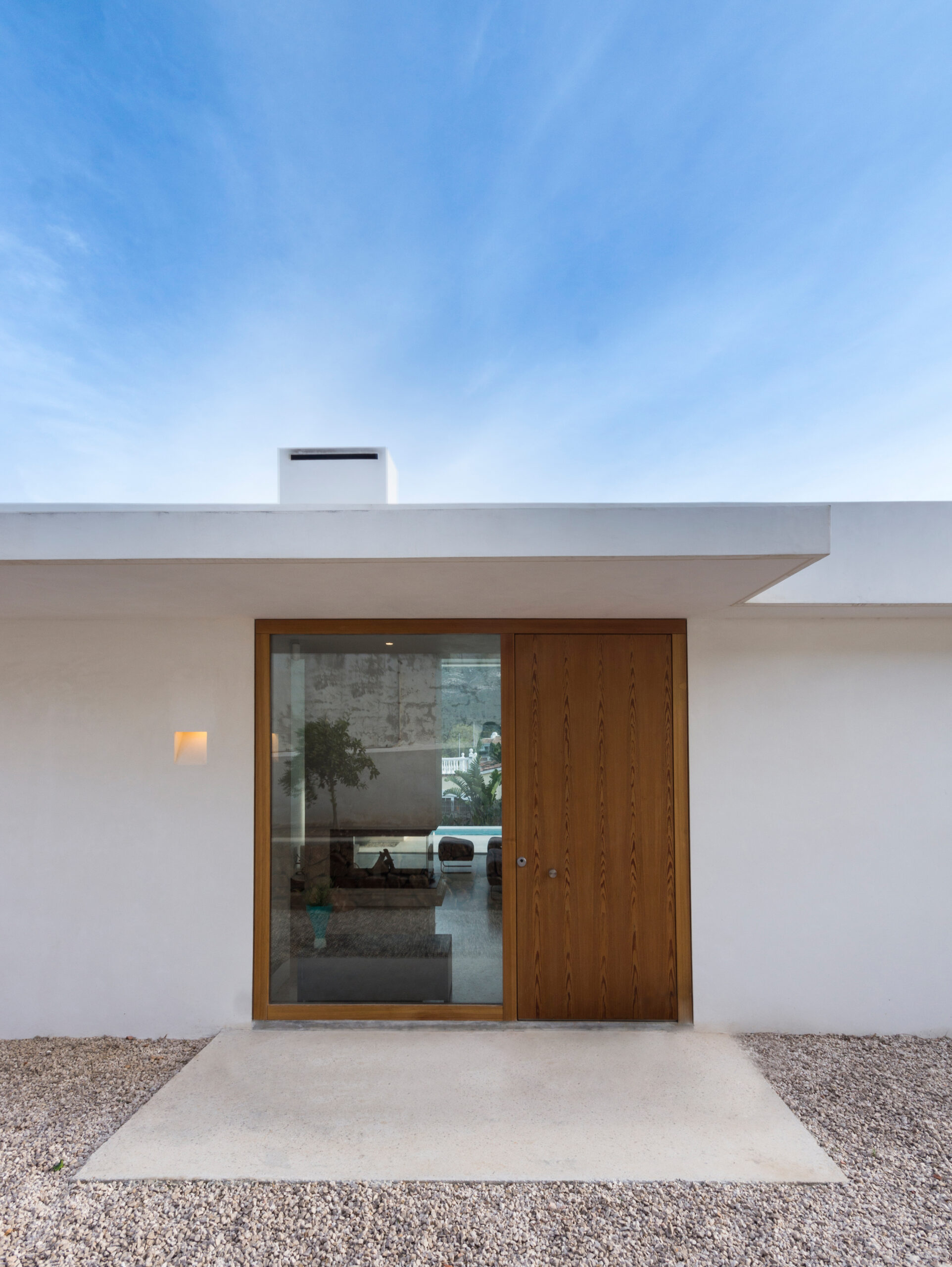 Una joya, blanca y sencilla, esta pequeña construcción de 120 m2 mira siempre al Montgó, cuya poderosa presencia lo convierte en un habitante fundamental de la casa. Al norte, es pequeño y concentrado, un muro blanco con sólo algunas pequeñas aberturas. Abierta y esbelta a la luz y a la montaña, su fachada sur está formada por enormes paneles correderos de cristal y voladizos de tejado diseñados para proteger el interior del intenso sol del verano. Pavimentos de hormigón pulido, paredes de yeso y paneles de arce componen la paleta de materiales utilizados para construir el espacio.