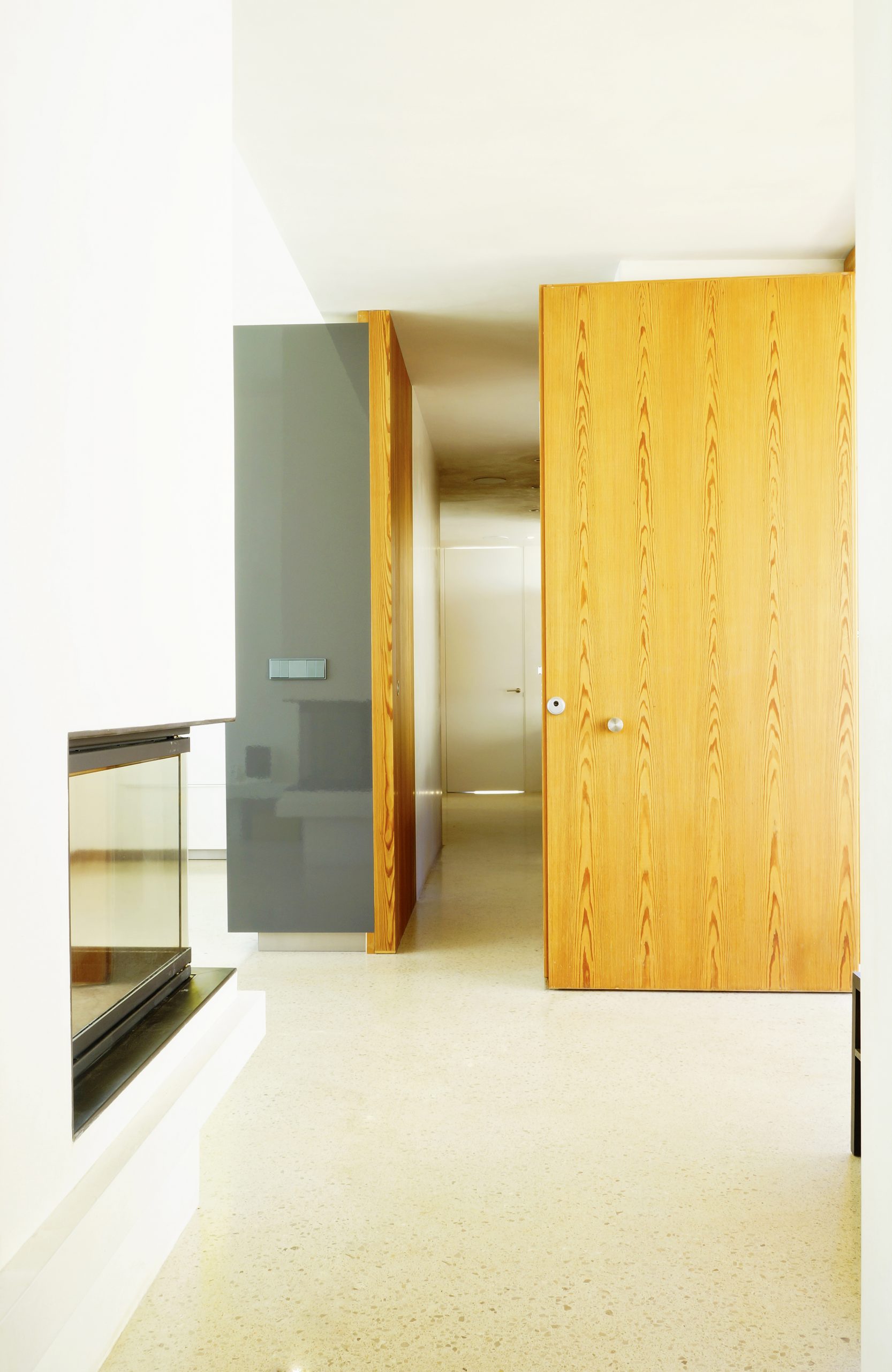 concentrated, a white wall with only a few openings. Open and slender to the light and the mountain, its southern façade is made up of huge sliding glass panels and roof cantilevers designed to protect the interior from the intense summer sun. Polished concrete paving, plaster walls and maple panelling make up the palette of materials used to construct the space.