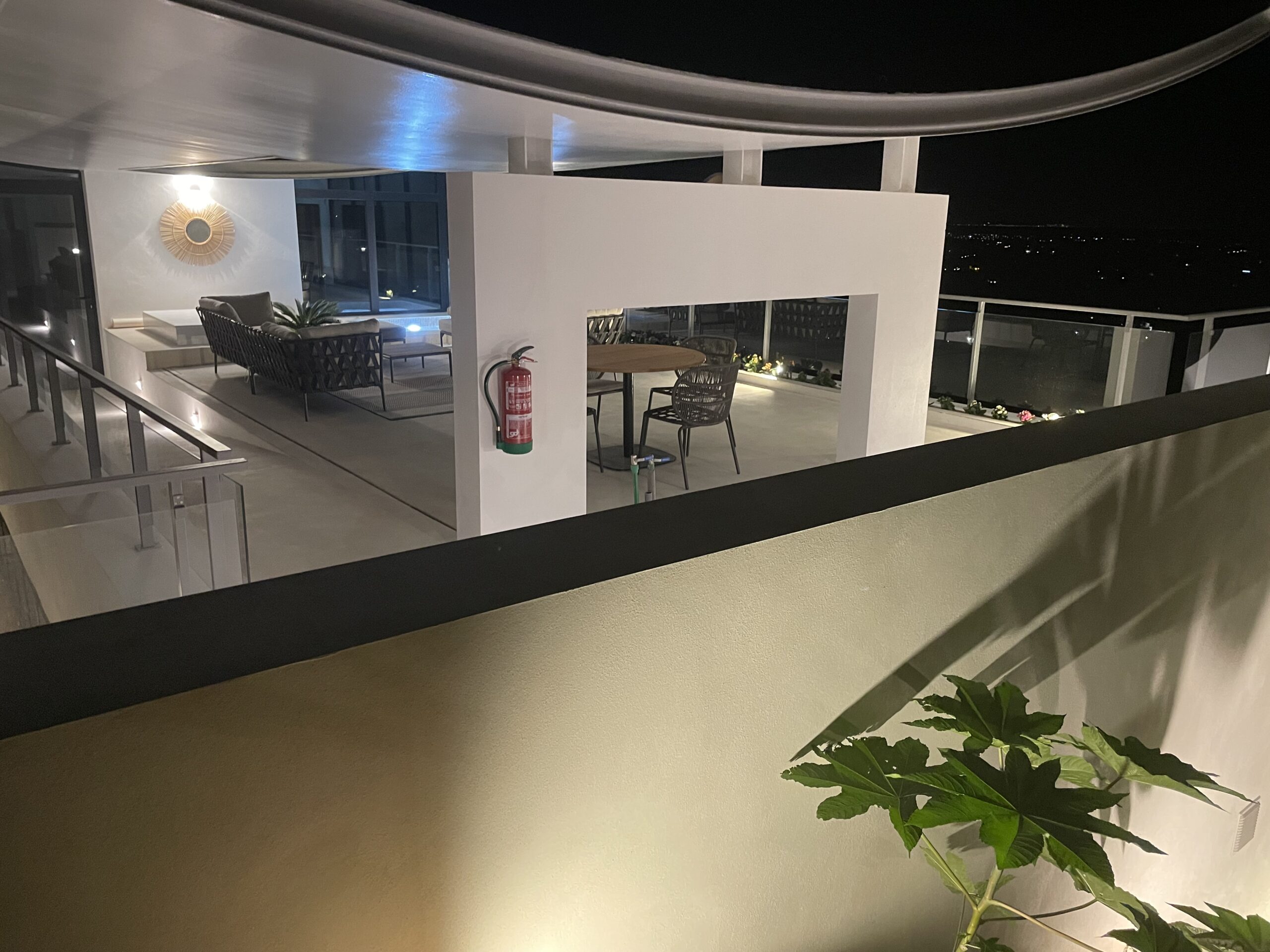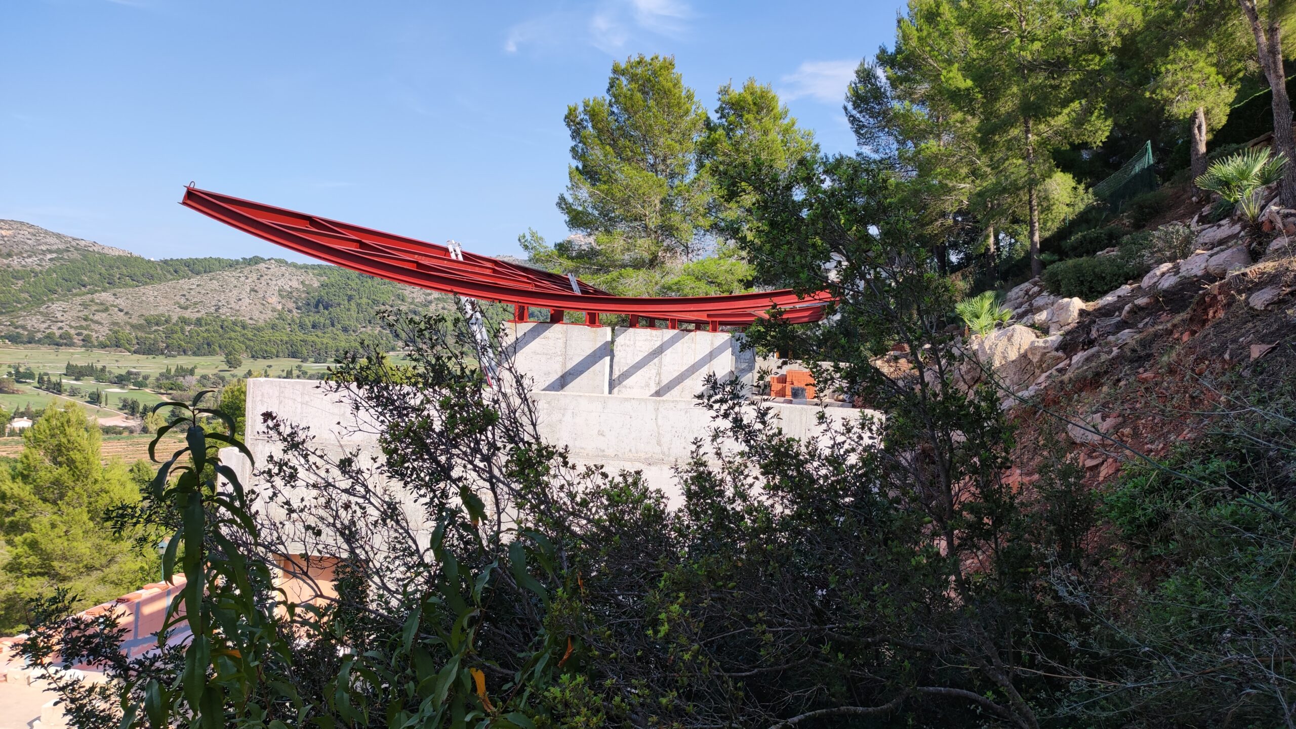 Unter Ausnutzung der Topographie des Grundstücks befindet sich das Haus auf einer Plattform 6 Meter über der Av. de la Marina Alta. Das Haus ist auf einer Ebene neben dem Schwimmbad organisiert, das ohne Erdbewegungen gebaut wurde, wobei das strukturelle System der Erdanspannung genutzt wurde. Auf dem Dach befinden sich eine große Terrasse und das Hauptschlafzimmer, alles unter einer leichten Struktur aus Stahlbeton.