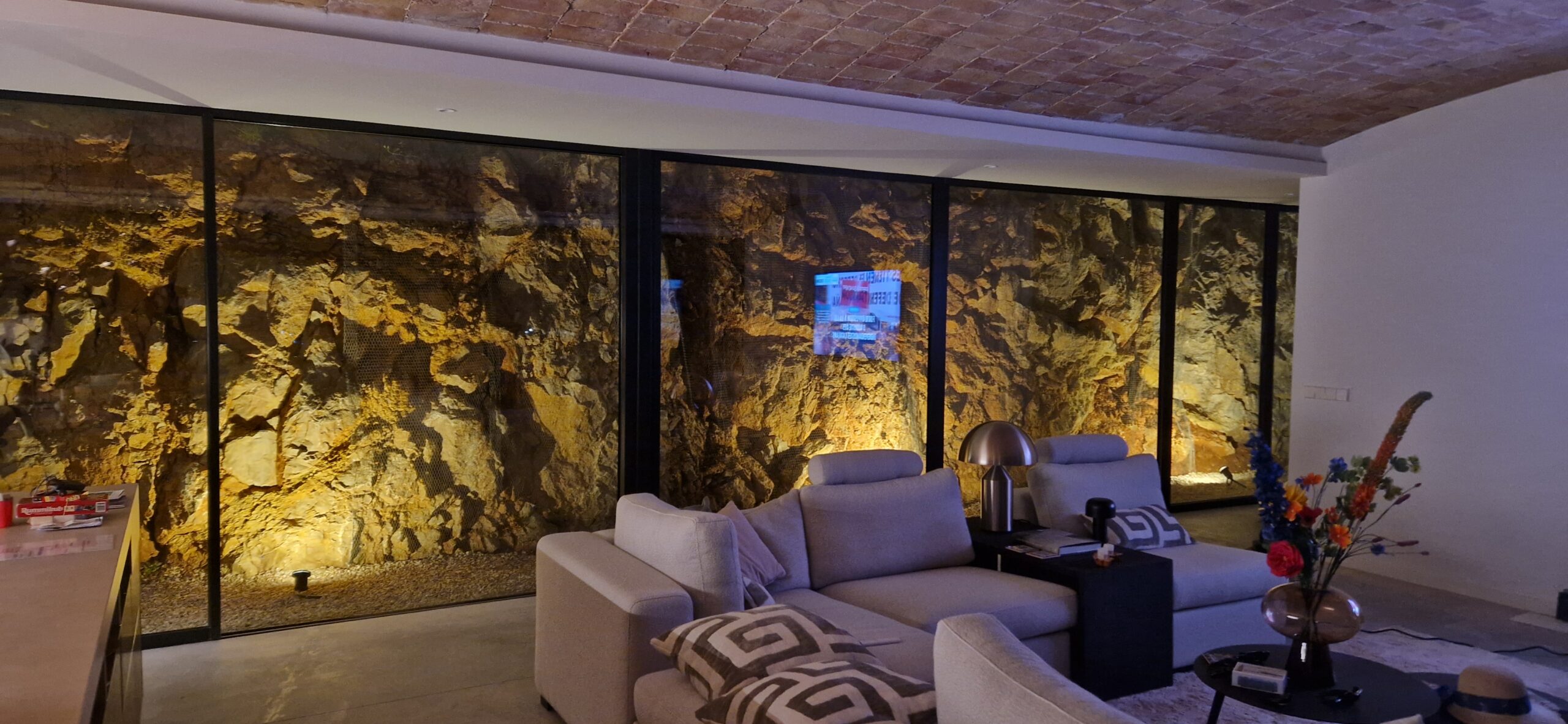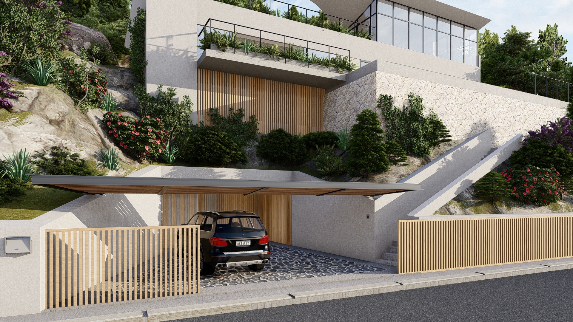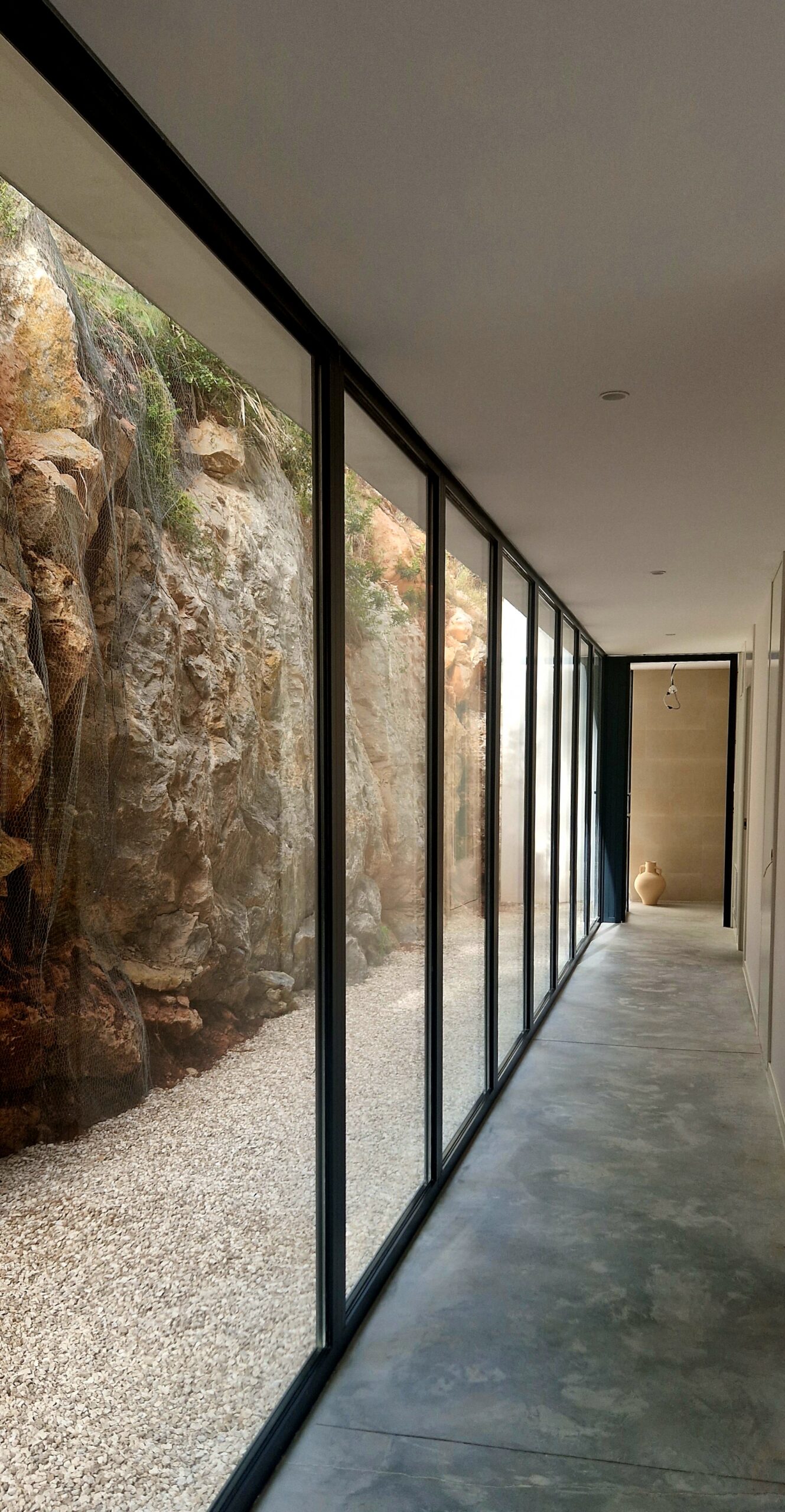 on one floor next to the swimming pool, which is constructed without the need for earth movement, taking advantage of the structural system of earth contention. On the roof there is a large terrace and the master bedroom, all under a light structural sheet of reinforced concrete.
