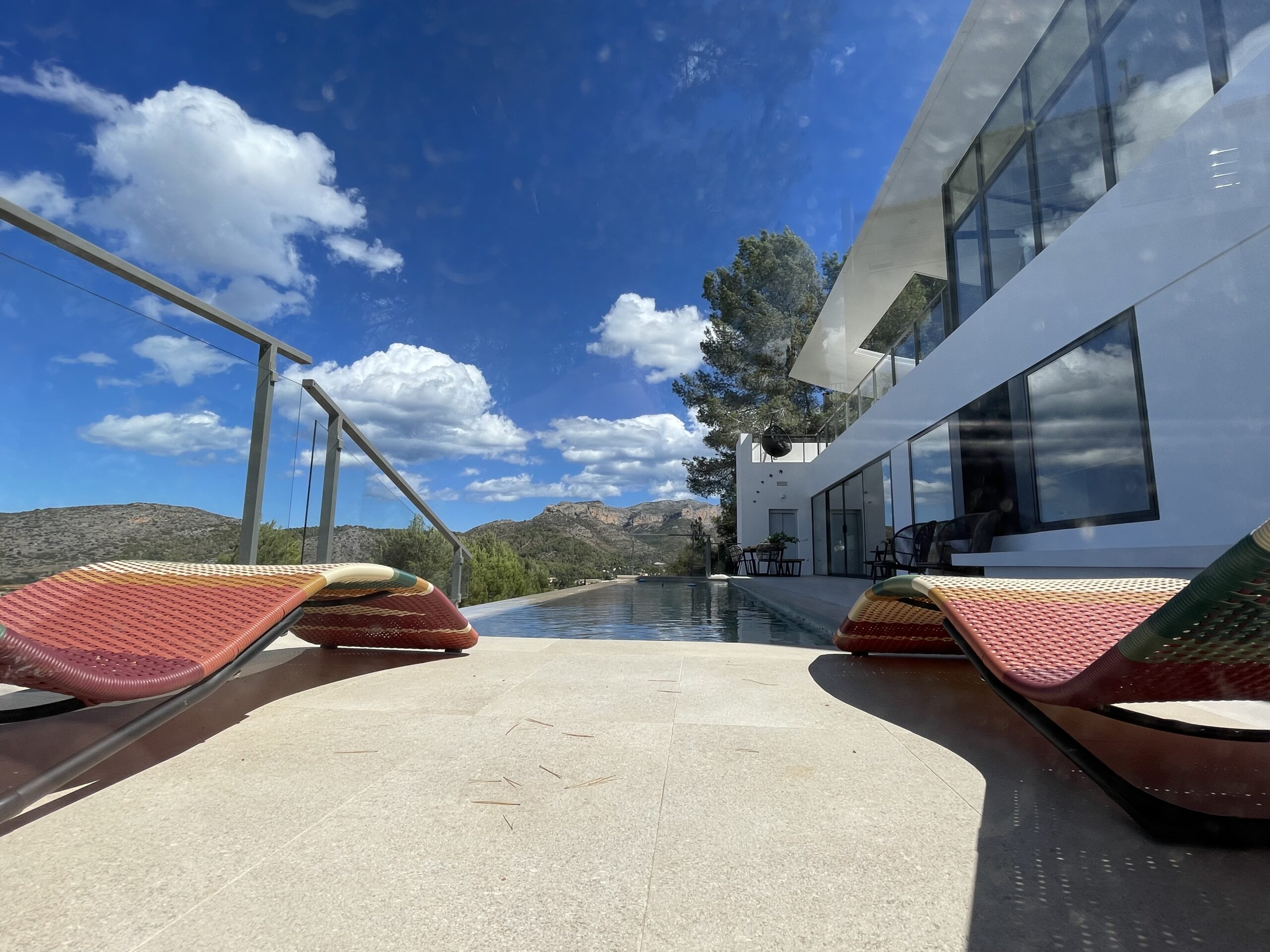 Aprovechando la topografía de la parcela, la casa se sitúa sobre una plataforma a 6 metros sobre la Av. de la Marina Alta. La casa se organiza en una sola planta junto a la piscina, que se construye sin necesidad de movimiento de tierras, aprovechando el sistema estructural de contención de tierras. En la cubierta se sitúa una gran terraza y el dormitorio principal, todo ello bajo una ligera lámina estructural de hormigón armado.