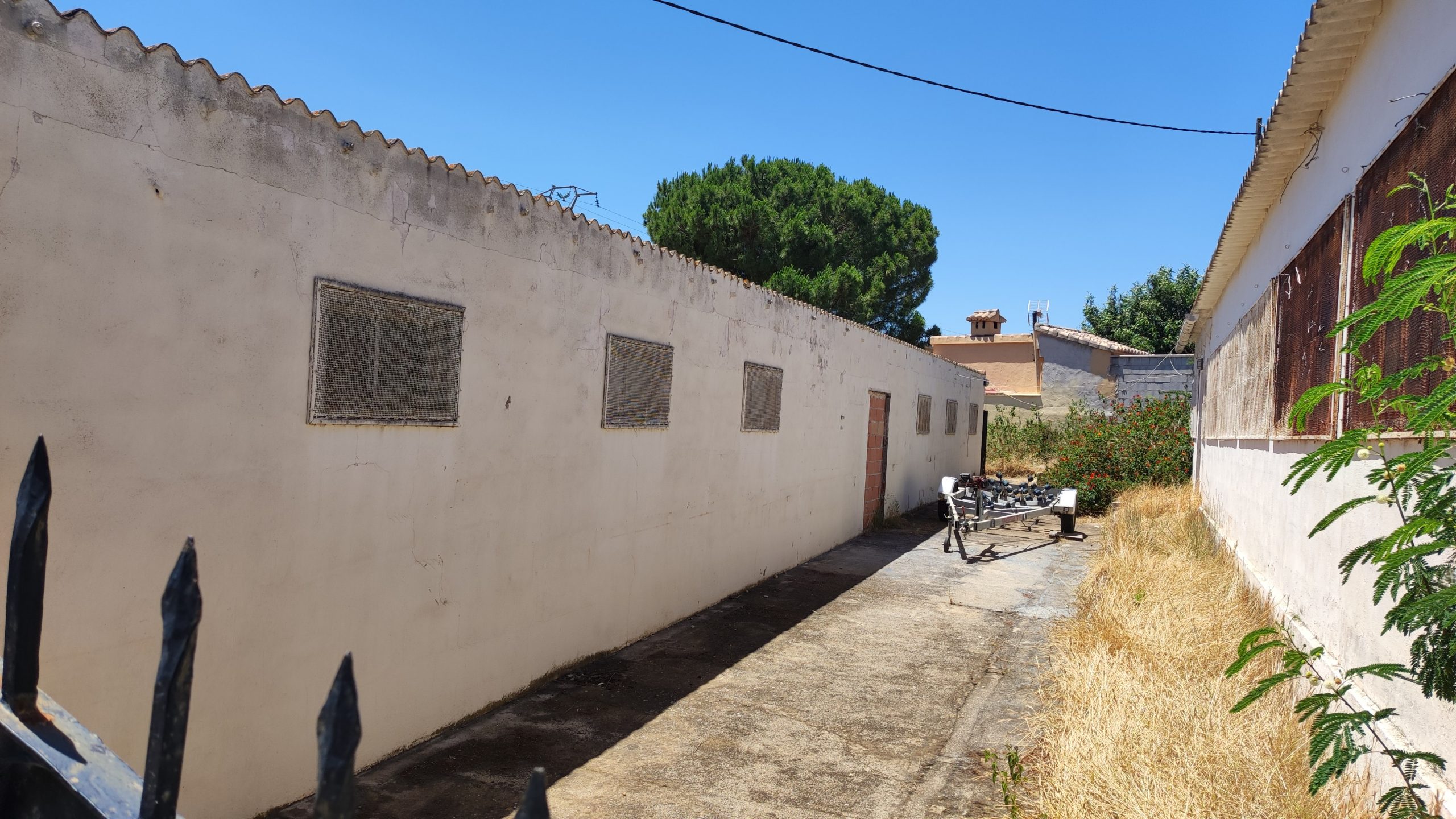 La nave principal se utiliza como vivienda, con una distribución abierta y luminosa que permite una amplia vista al patio y piscina.