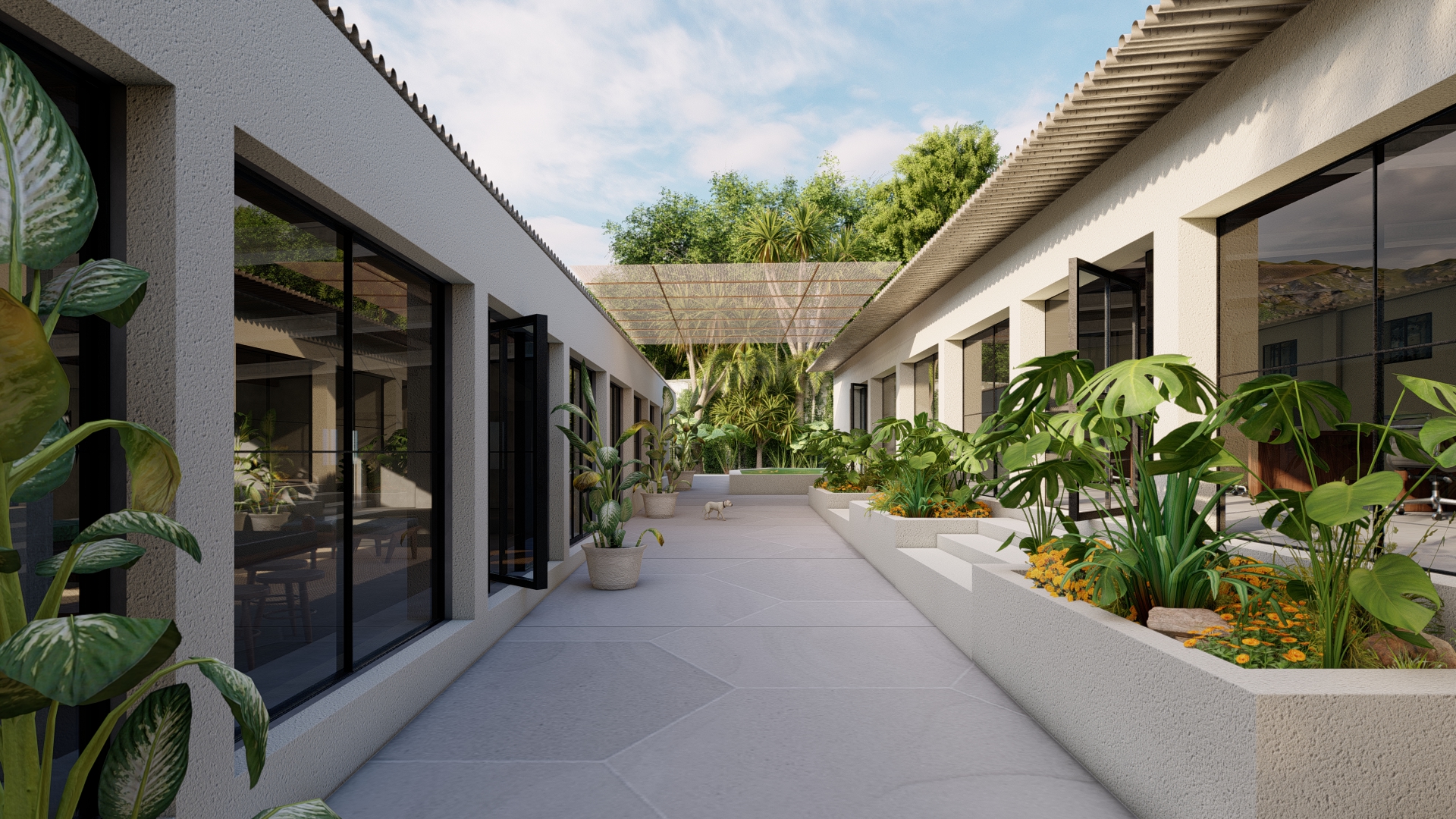 Bei diesem Projekt wurden zwei bestehende Industriegebäude in einen multifunktionalen Lebensraum und ein Architekturstudio umgewandelt. Der Raum zwischen den Lagerhallen wird zu einem mediterranen Innenhof mit einer üppigen Vegetation und einem kleinen Swimmingpool, der in den heißen Monaten die Temperatur des Außenbereichs reguliert. Die Kombination aus exotischen Pflanzen und einem nachhaltigen Bewässerungssystem, das Regenwasser zurückgewinnt, schafft eine grüne Oase im Herzen des Grundstücks.